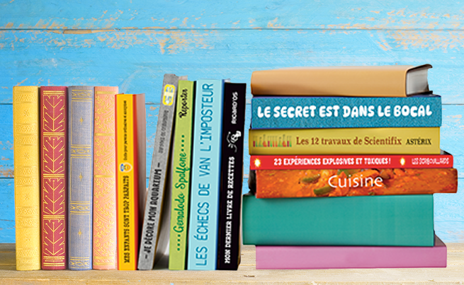 Télécharge, découpe et colle ces faux titres sur les épines (qui relient les deux couvertures) de livres que tu as chez toi.