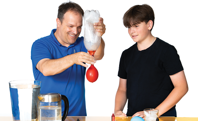 4. Puis fais chauffer de l’eau et remplis-en la bouteille vide. Ensuite, verse l’eau dans le ballon rouge en enfilant le col du ballon autour du goulot de la bouteille. Referme le ballon.
