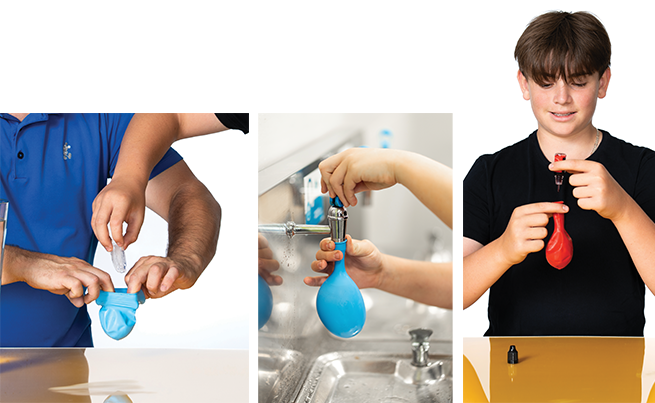 6. Perce un ballon à la fois à l’aide d’un exacto. Observe attentivement comment l’eau colorée s’échappe de chacun d’eux.