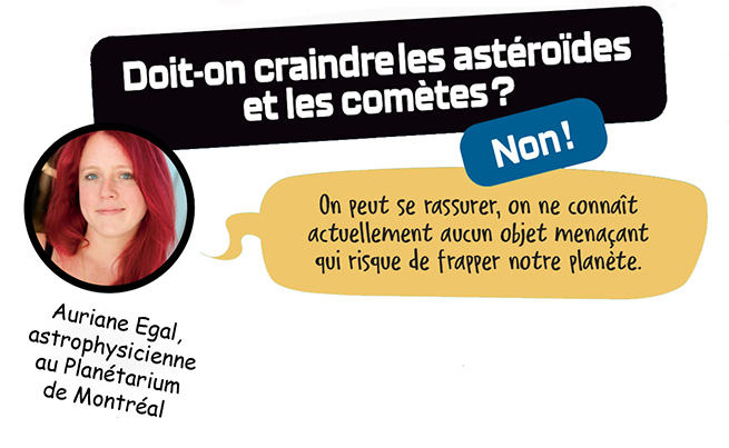 Mais la bonne nouvelle, c’est qu’on les détecte de loin puisqu’ils sont gros! Si on trouvait un objet géocroiseur menaçant, on aurait donc plusieurs années pour éviter une collision. Il faut savoir que même si certains se déplacent à des dizaines de milliers de kilomètres par heure, ils partent de très loin, à des millions de kilomètres du Soleil.